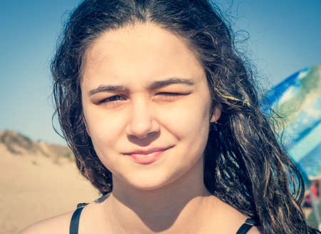 Portrait of brunette female teenager with long dark hair in black swimsuit singlet squinting looking at camera. Sandy beach and sun umbrella at background.
