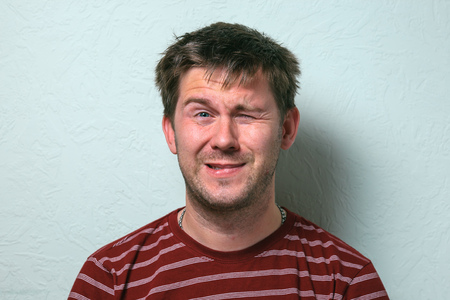 Man with an inflamed eye due to a bacterial infection of the upper eyelid resulting in a stye or hordeolum and conjunctivitis with purulent discharge in a medical concept