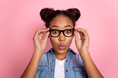 Photo of young african woman pouted lips hands touch eyewear vision eyesight isolated over pink color background
