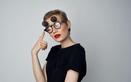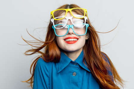 woman with multicolored glasses on her face in blue shirt posing glamor