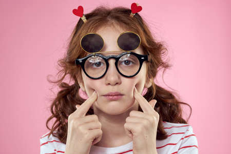 Girl in fashionable glasses and clothespins on her hair emotions pink background