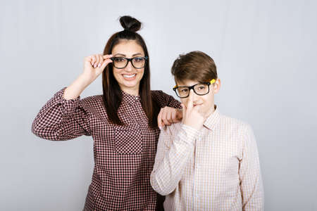 Studio Portrait of happy family mom and teenager son boy in colored glasses having fun