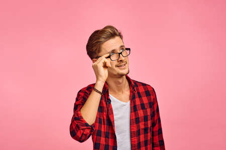 Serious man in glasses, pink background, emotion