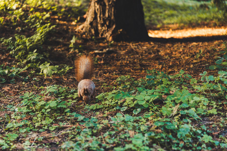 Squirrel in the autumn forest. Wild animal in the nature.