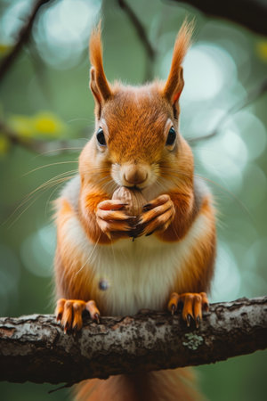 A close-up of a squirrel on a tree branch, holding walnut with its paws, surrounded by soft-focus leaves