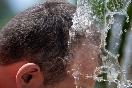 the silhouette of a happy man playing in a fountain of water in the light of the setting sun. Gurgling water fountain in the city Park on a hot summer day.
