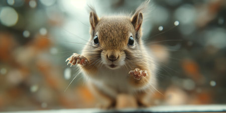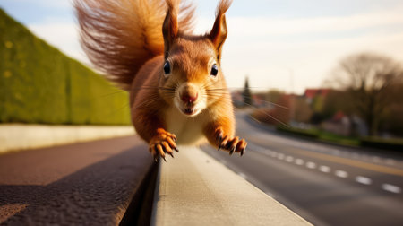A charming squirrel poses adorably in the street, perfectly blending nature with urban life. Its curious expression and fluffy fur capture the essence of wildlife.
