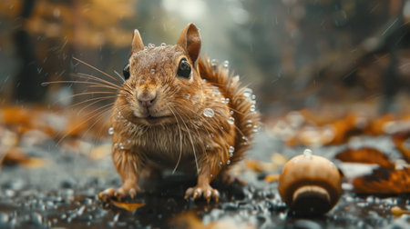 Squirrel in the rain on the background of autumn leaves and acorns