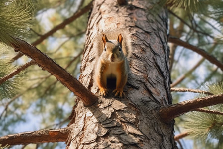 A charming squirrel perched on a pine tree branch captures the essence of wildlife in a serene natural setting, showcasing intricate details of its fur and features.