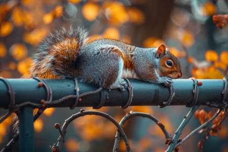 Relaxed Squirrel Lying Flat on a Metal Railing During Autumn.