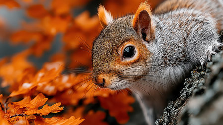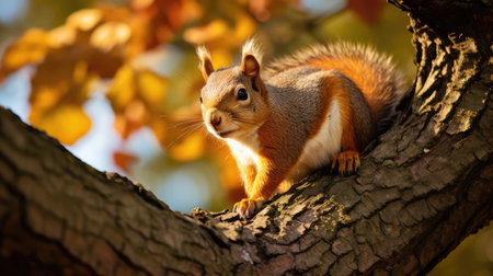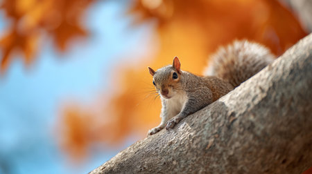 Eastern gray squirrel clinging to a tree branch amidst vibrant fall foliage, soaking in warm autumn colors and embodying the seasons charm