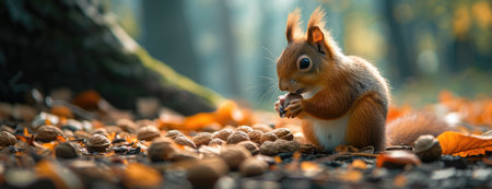 Squirrel gathering acorns on the forest floor