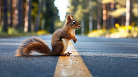 A charming squirrel poses adorably in the street, perfectly blending nature with urban life. Its curious expression and fluffy fur capture the essence of wildlife.
