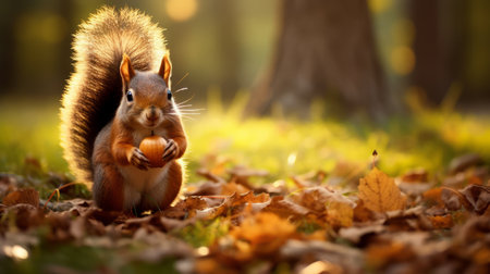 Squirrel Holding a Nut Amidst Autumn Leaves