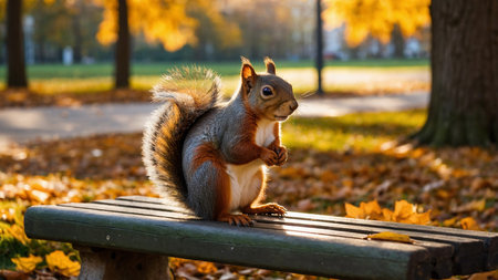 The image captures a squirrel poised on a wooden park bench, surrounded by vibrant autumn leaves and illuminated by golden light, with trees and a walking path in the background, signaling a serene fall day. AI generated image