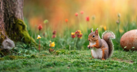 Squirrel in the park with flowers and green grass. Autumn season.