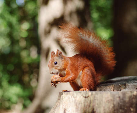 Squirrel in the forest. The red squirrel, Sciurus vulgaris