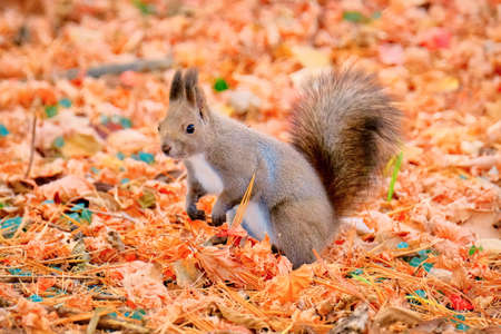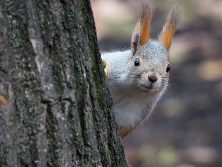 Squirrel in the autumn park. Red gray squirrel portrait close up