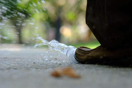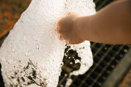 Fountain in the city park.A child's hand touches a stream of water that gushes out from under the grate on the ground. Refreshing children's fun in the summer.