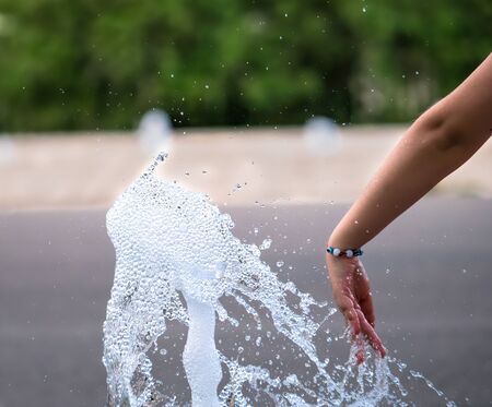 Hand touch the fountain. A stream of water from the fountain is touched by hand.