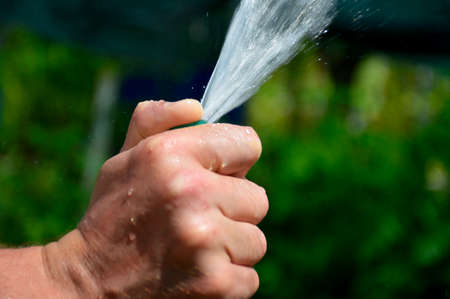 a man's hand holds a hose from which a stream of water breaks out, water is sprayed and irrigates everything around with drops of moisture