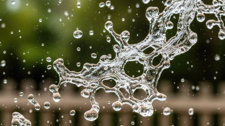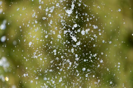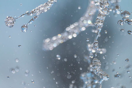 San Francisco, USA - August 2019: Close up of water drops from a fountain frozen in time