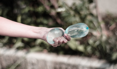 Splashes of water pouring from a watering tap into a plastic container in the backyard