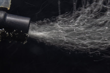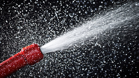 Close-up of high-pressure water spray shooting from a red hose nozzle against a dark background, emphasizing power and control
