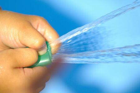 A hand holds a yellow hose with a nozzle on a background of blue sky with water splashes. The concept of landscaping and park care. Copy space