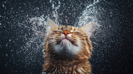 This captivating image showcases a cat experiencing a playful splash of water, radiating joy and curiosity in a mesmerizing moment filled with dynamic droplets.