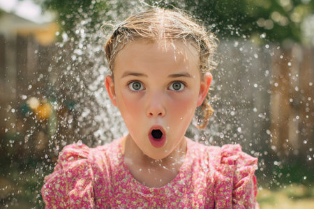A young girl in a backyard garden is caught by surprise as she accidentally steps on a sprinkler jet, soaking herself. Her open-mouthed expression captures the playful moment.