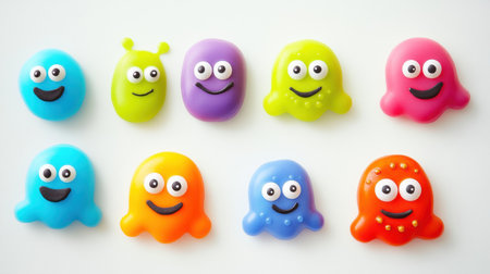 Brightly colored microbes with eyes and smiles form a fun and lively arrangement, showing their playful personalities.