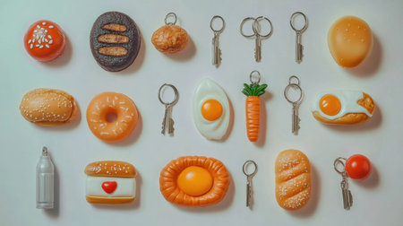 This image showcases a vibrant collection of food-inspired keychains, featuring colorful items like eggs, carrots, and donuts. Perfect for gifting!