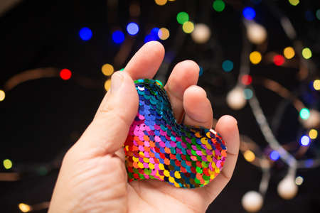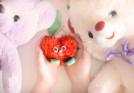 Child holding handmade soft heart, cute craft for Valentines day or birthday. DIY