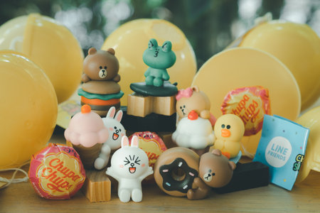 Samut Prakan, Thailand - January 3, 2021 : Line friend figure toy inside Chupa Chups Lollipop (Chupa Chups X Line friends)