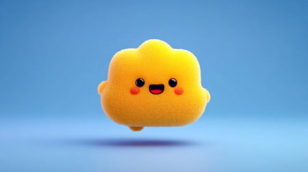 A cheerful cartoon cloud character is depicted against a clean, light blue backdrop. The yellow cloud has a soft, fluffy appearance with a smiling face and rosy cheeks. The illustration uses bright colors, a simple style, and soft lighting, ideal for various commercial applications and designs.