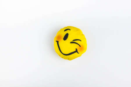 Filmed in Minsk, Belarus december 2, 2018.Funny smiley face on white background. The concept of positive mood. Empty text space