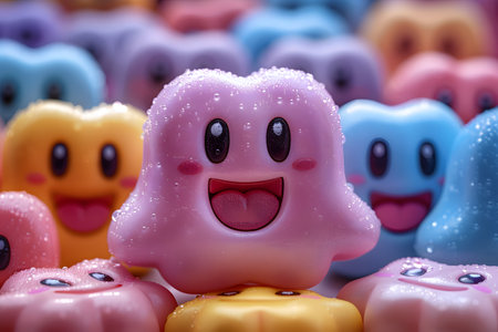Vibrant and cheerful close-up of multiple cute, smiling water droplet characters in various colors. each character features a happy expression, with some displaying droplets of water, perfect for designs targeting children's products or playful decorations. Generative AI