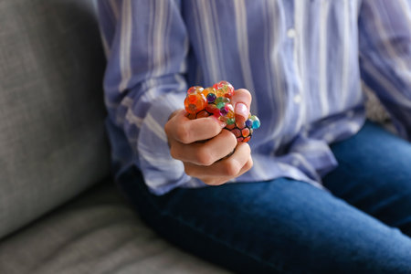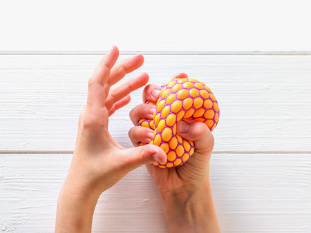 Toy against stress in the hands of a child on a white wooden table. A calming device. Treatment of mental disorders.