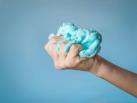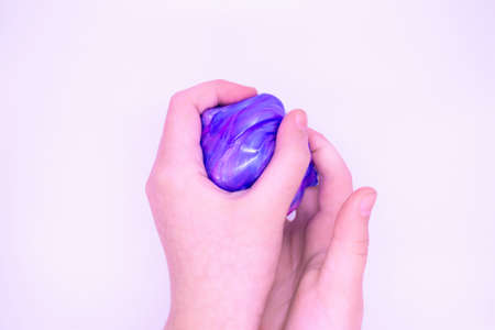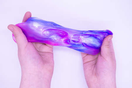Close up of game with two-color blue and pink slime in someones hands on a white background. The mucus is crushed, stretched, torn and squeezed by hands.