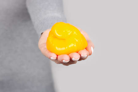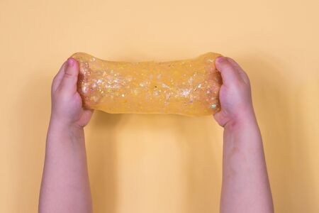 Girl stretching colorful orange slime on the sides. Childrens hands playing slime toy on an orange background.
