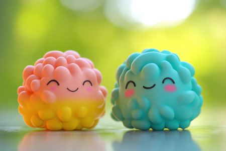 Two adorable colorful characters with cheerful expressions sit against a soft background. Their playful design adds a touch of whimsy and joy to any space.