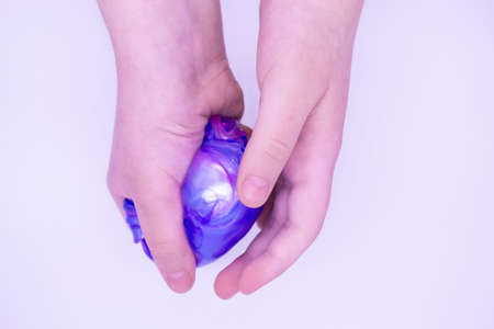 Slime in the hands of a child. A girl pulls an elastic band. Hobbies for preschoolers and schoolchildren. Fun for the little ones