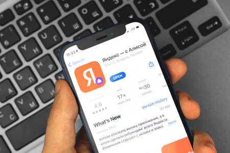 Kharkov, Ukraine - April 2, 2021: Man using Apple iPhone with Yandex application
