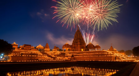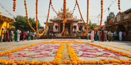 A vibrant Indian temple during a festival, with strings of marigold flowers, colorful rangoli patterns on the ground, and the sound of bells ringing as people gather to celebrate. The cultural and joyous scene feels divine.