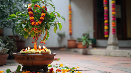 A beautifully arranged festival scene showcasing a plant adorned with colorful flower garlands and traditional lamps. This vibrant setup captures the essence of cultural celebrations.