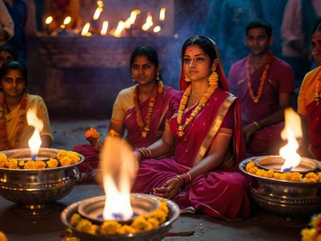 Ganges Aarti Festival. Priests and officiants guide the Ganga Aarti ritual, chanting mantras, offering prayers, and ensuring the proper conduct of the ceremony.
