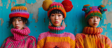 A smartphone with a blank screen is centrally placed, surrounded by colorful sweaters, decorative accessories, and floral elements. The composition features a top-down view, with a bright, neutral background. The sweaters display varying shades of brown and orange. Suitable for diverse commercial purposes, including marketing and design projects.