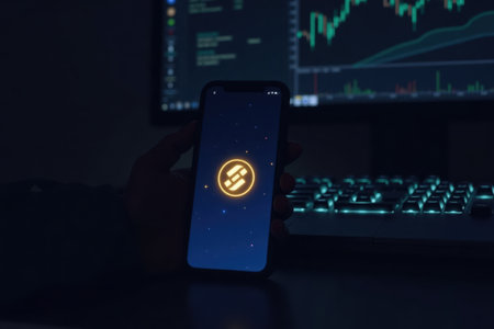 A futuristic stablecoin logo glows on a smartphone screen in a dark room. Soft light illuminates the space, showcasing tech gadgets and a digital dashboard.