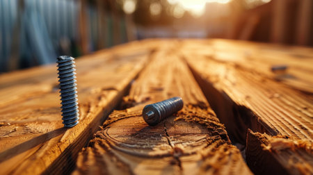 This image captures a close-up view of metal screws placed on a wooden surface, illuminated by warm sunset light. The detailed texture showcases craftsmanship.